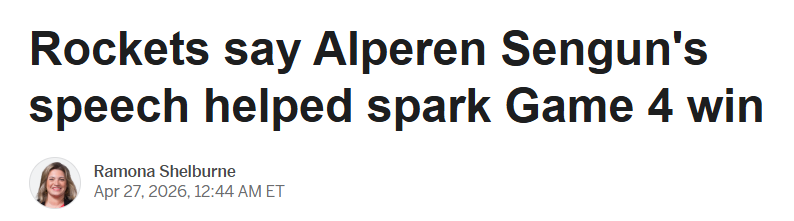 北京时间4月27日,火箭115-96击败湖人,将总比分扳成1-3,避免了被横扫的结局。ESPN揭秘火箭本场大胜,特别提到了申京赛前的讲话,鼓舞了火箭全队的士气。
